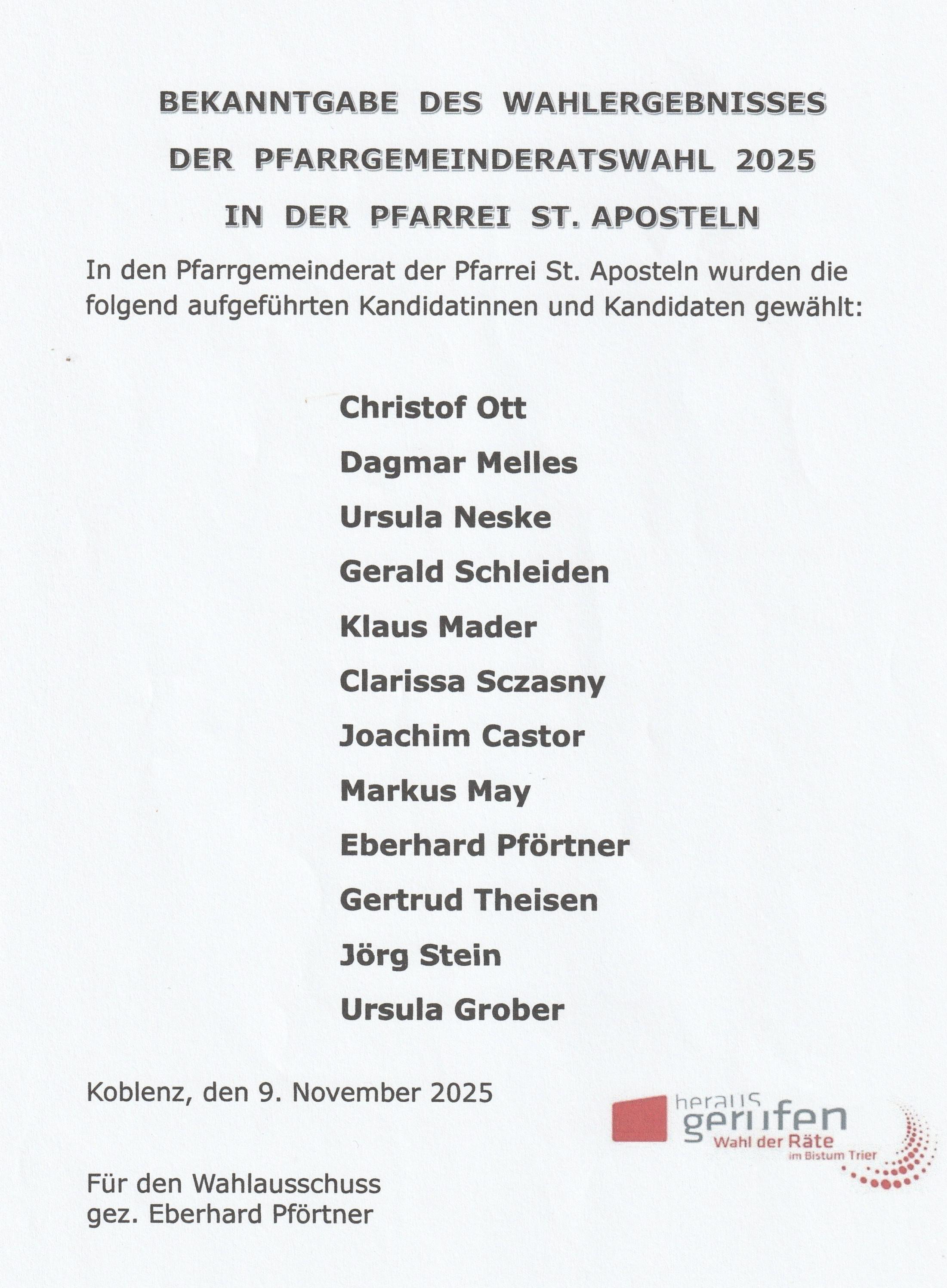 Ergebnis der Pfarrgemeinderatswahl