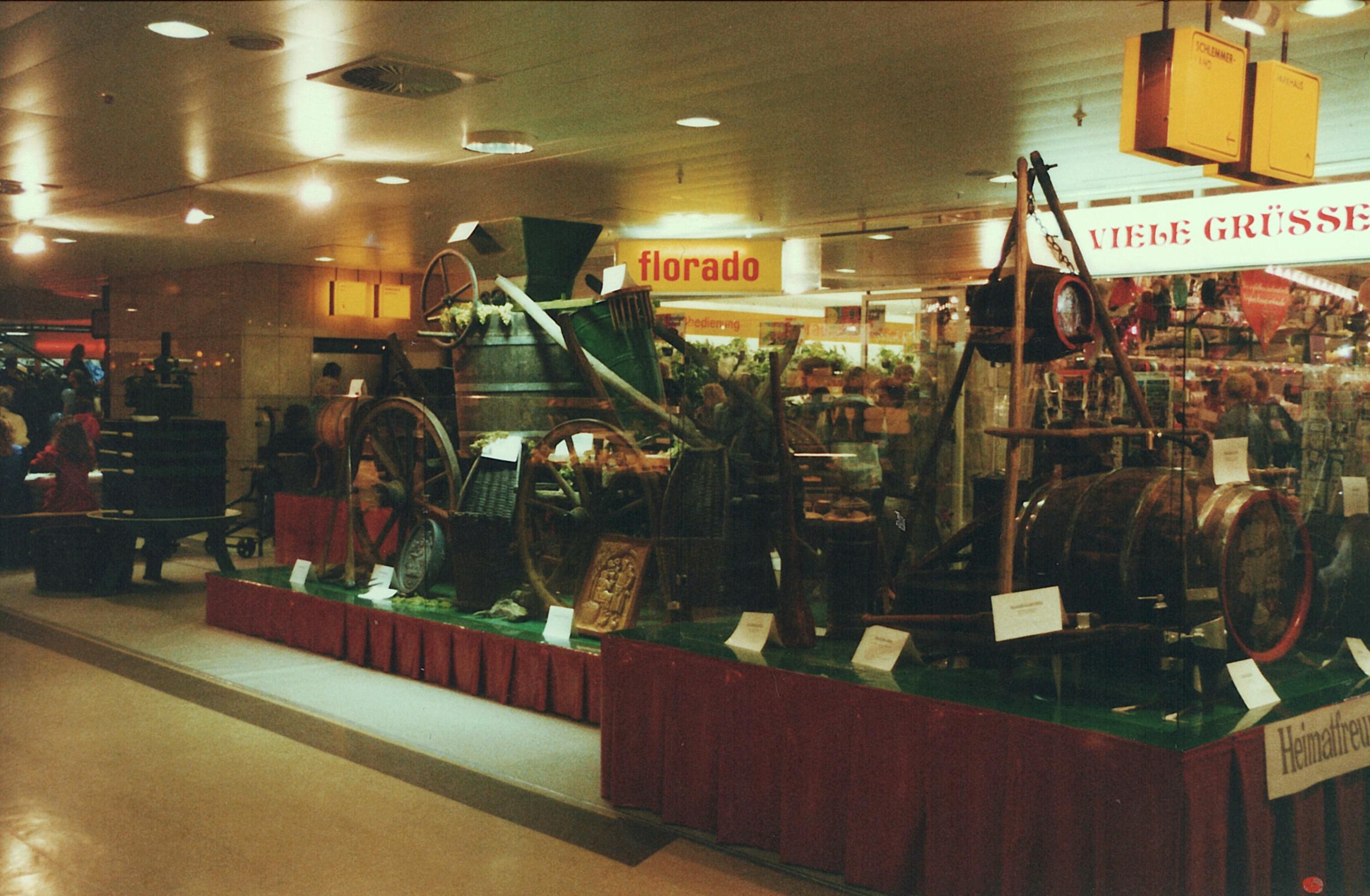 Hierzu stellten die Layer Winzer rund 50 im Weinbau benötigte Gerätschaften aus Weinberg und Keller zur Verfügung, die im Löhr-Center zu einer gelungenen Präsentation zusammengestellt wurden. Dazu gehörten ein Pferdefuhrwerk als Lesewagen mit Bütte, Lesebüttchen, Traubenbotte, Traubenmühle etc. für die Arbeiten im Weinberg. An Kellergerät stieß eine über 100 Jahre alte Weinkelter mit Druckwerk auf großes Interesse. Eine ebenso alte Handpumpe aus Messing, sowie Holzfässer, Holztrichter, Weinfilter, Handkorkmaschine, Fassstangen und vieles mehr gehörten zur Ausstellung.