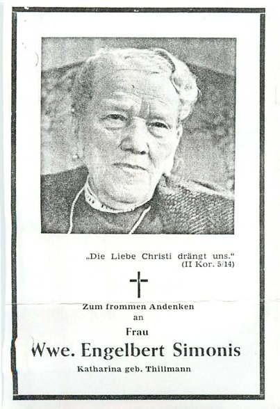 Nach bevor Katharina heiratete, musste sie den Tod ihrer erst 20jährigen Schwester Maria betrauern. Im Jahre 1891 vermählte sie sich mit dem Brauereidirektor Engelbert Simonis. Das einzige Kind aus dieser Ehe verstarb im Alter von nur 6 Tagen! Vater Joseph Thillmann, der seine Brauerei in guten Händen des Schwiegersohnes wusste, konnte sich nun seiner geliebten Tätigkeit als Bauunternehmer widmen. – Sehr aktiv und erfolgreich, bis er im Alter von nur 60 Jahren plötzlich verstarb. Seine Ehefrau -Katharinas Mutter- folgte ihm nur fünf Jahre später.