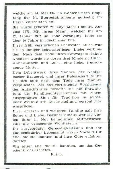 Wie der Totenzettel beschreibt, kümmerte sich Katharina liebevoll um die Kinder. Ihre und ihres Mannes Fürsorge und Erziehung der Waisenkinder waren offensichtlich sehr erfolgreich. Insbesondere wurde die Königsbacher Brauerei von ihnen bzw. ihren Nachkommen an führender Stelle geleitet. Auch Katharina selbst setzte sich nach dem Tod ihres Mannes -nach 40jähriger Ehe- tatkräftig in der Leitung der Brauerei ein. Sie war stellvertretende Vorstandsvorsitzende.