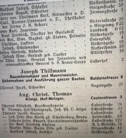 So erreichte die Familie mit ihrer sechsjährigen Tochter Maria und ihrer dreijährigen Schwester Katharina die Stadt und zog in die Balduinstraße Nr. 8. Ein Grund für diesen Umzug war wahrscheinlich, dass Thillmann sich den strapaziösen täglichen Fußmarsch zur Arbeitsstelle nach Koblenz (und zurück) ersparen wollte. Bereits im Jahre 1883 inserierte der fleißige Maurer im Adressbuch der Stadt Koblenz: